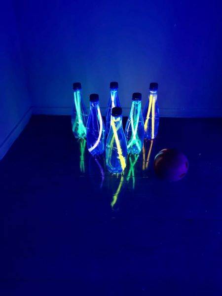 Glow in the dark bowling is one of the simplest party games to set up and the kids will love it! All you need is 6 water bottles, preferably shaped like bowling pins, (however this doesn't matter), 1 x packet of glow sticks, 1 x small - medium sized rubber ball and of course some black lights.