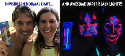 If you want to spend a little more money you can buy neon glow paints and canvases and let the kids paint as though they are in a real art studio. Another option is to let the kids use each other as the canvases. Using special UV reacting ink pens or regular highlighter pens (yellow, green, pink and orange work best), the kids can draw glowing designs on each other's faces, arm and legs. Or if you want to buy each of the kids a white tshirt they can design their own glowing clothing (best to buy clothing specifically for this in case the ink doesn't wash out).