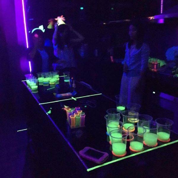 Fill up clear plastic beer pong cups with neon drinks that glow underneath black light (click here for glowing drink recipes) and challenge your friends. Use neon colored ping pong balls, or paint them with neon colored paint, to really make them pop as they fly through the air.