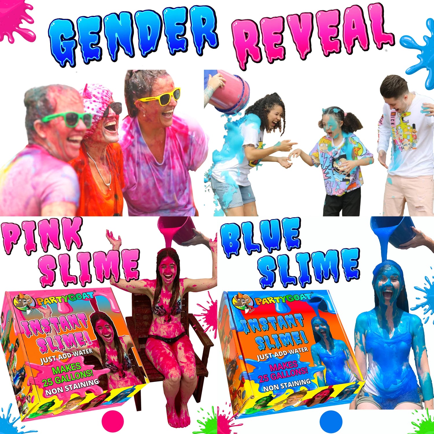 2. 2 x bags of Party GOAT™ Instant slime, blue and pink colored. - You can make huge quantities of runny slime by simply adding water (another highly recommended option is to buy the 4 color Slime Battle pack. After the reveal, hand out water blasters and use the remaining slime for a super fun slime fight amongst the willing party guests).