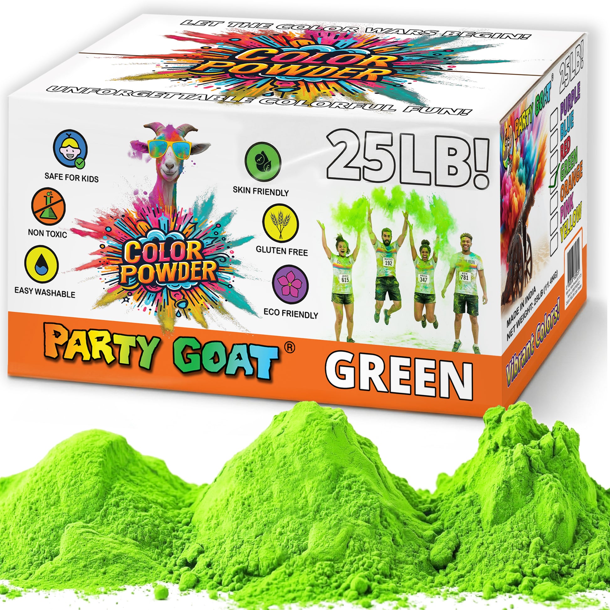 - 7 VIVID COLORS AVAILABLE – Ignite your next event with 25 pounds of our premium quality Holi powder. Choose from 7 richly saturated colors: Blue, Pink, Red, Purple, Green, Orange, and Yellow. This bulk pack is designed for massive impact, making it the perfect choice for color run stations, color wars, school house competitions, or high-energy sports team entries.