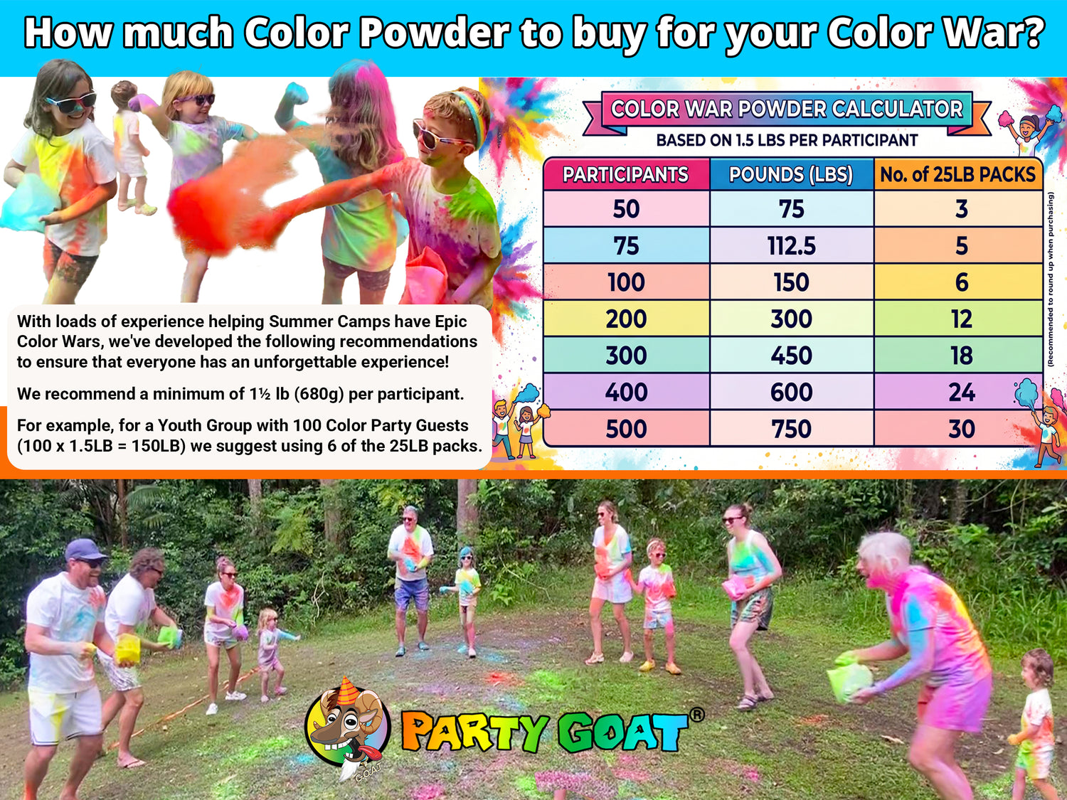 For color wars we recommend a little more powder per participant than what is recommended for a color run as the powder is usually thrown thick and fast in a color war. 1.5lbs per participant is usually a good starting point for a fun color war.