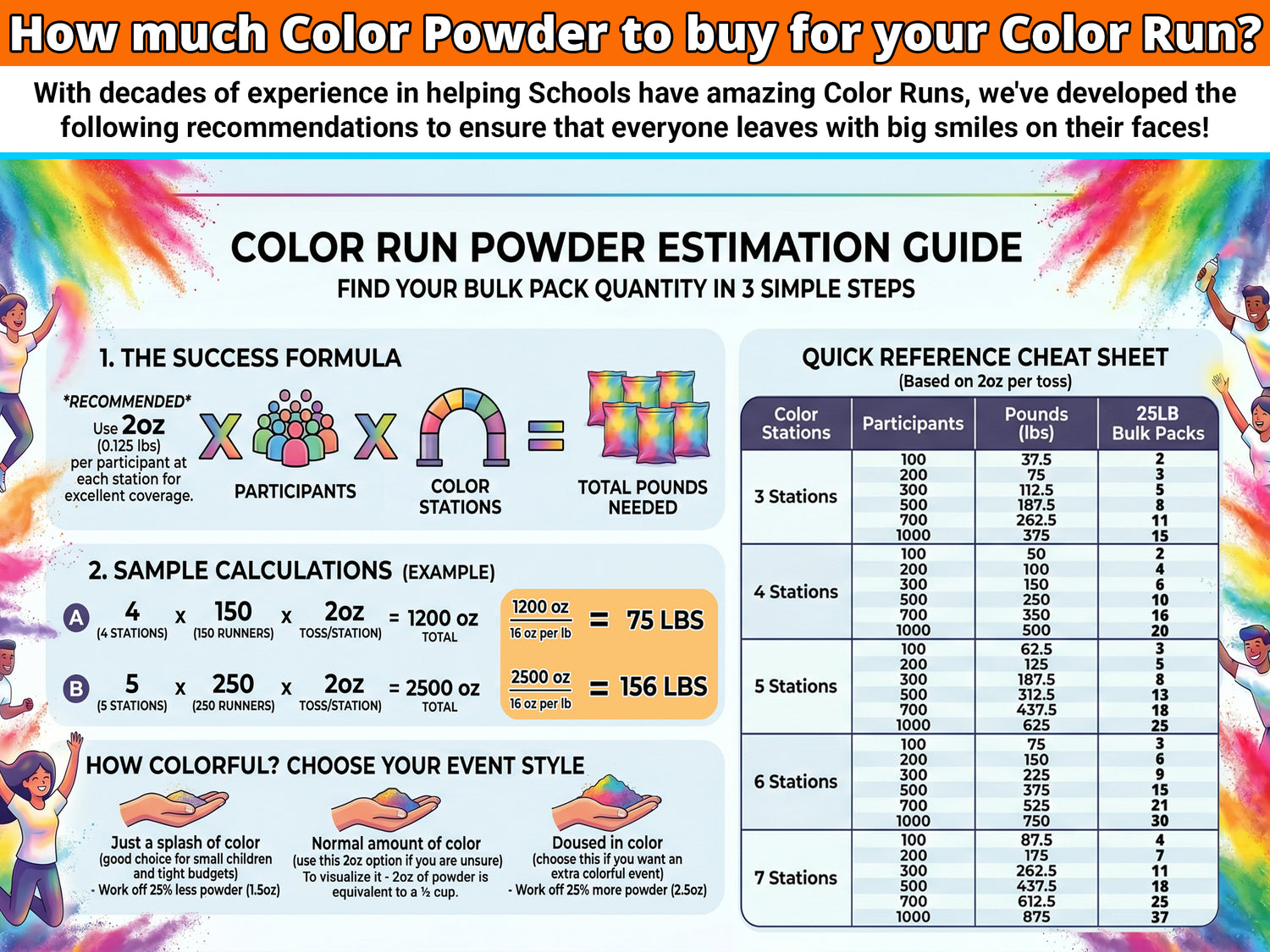 We recommend planning for 2oz (0.125lbs) of powder per participant per station. If you are having 4 color stations you need approximately 0.5lb per participant. 2oz of powder is approximately 1/2 measuring cup. Instruct the volunteers to throw a 1/2 cup of powder at each runner at each station.