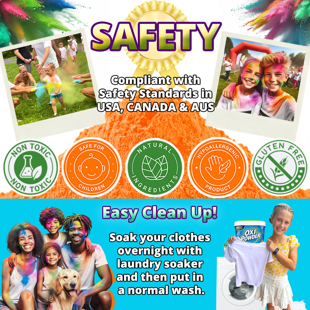 - PREMIUM QUALITY & WASHABLE – Our color run powder is made from natural cornstarch and food-grade coloring. Our Holi powder is non-toxic, gluten-free, biodegradable and safe for kids and pets. While it is richly colored, it is formulated to be easily washed off skin and clothing, making it ideal for school fundraisers and youth groups.