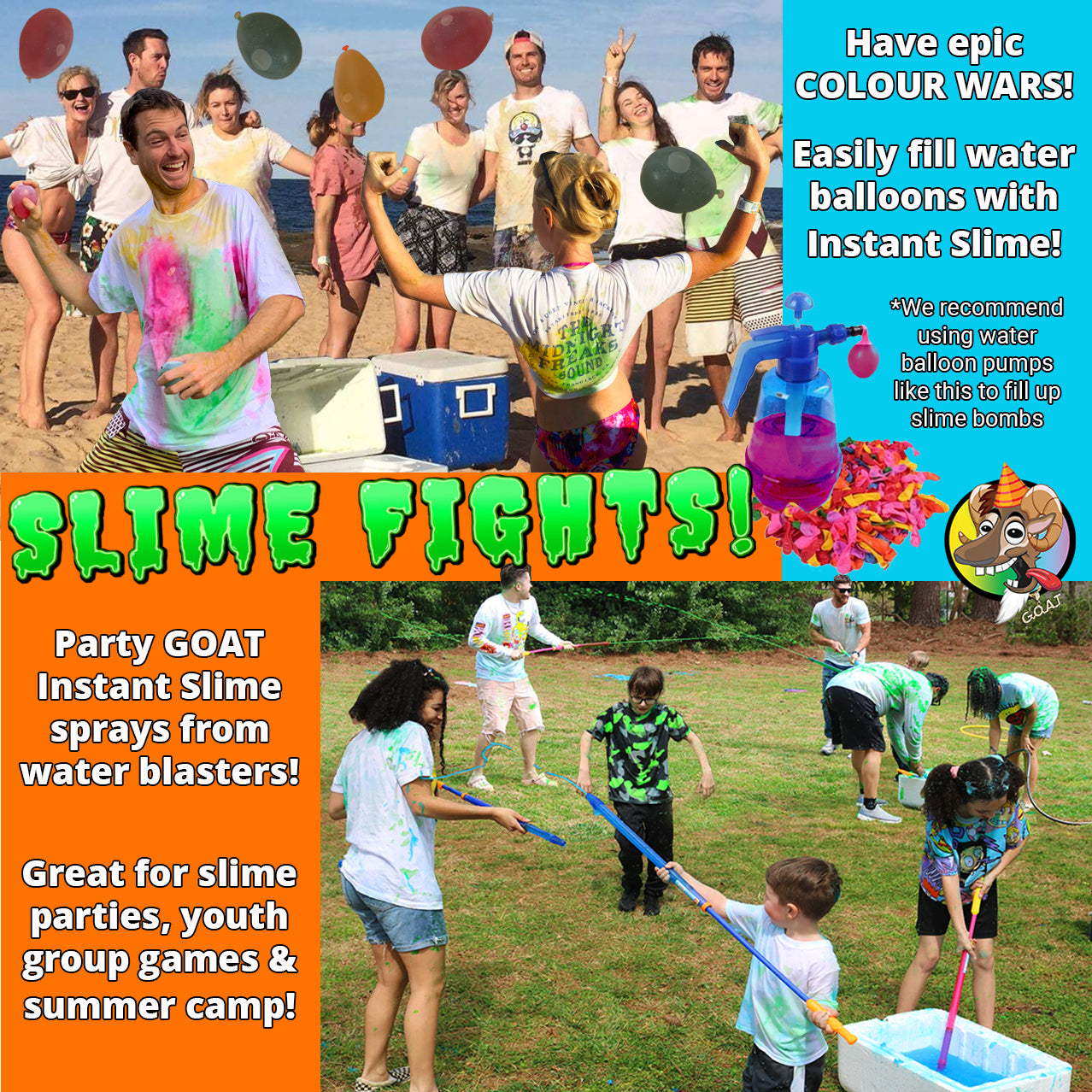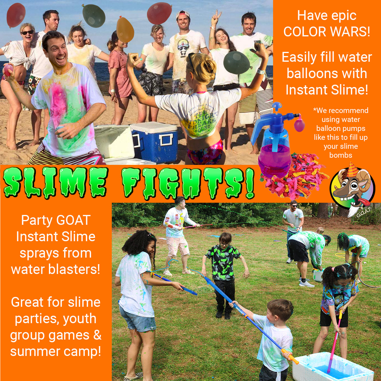- Instant slime can be used with water blasters for slime blaster battles or water bombs for slime bomb fights!