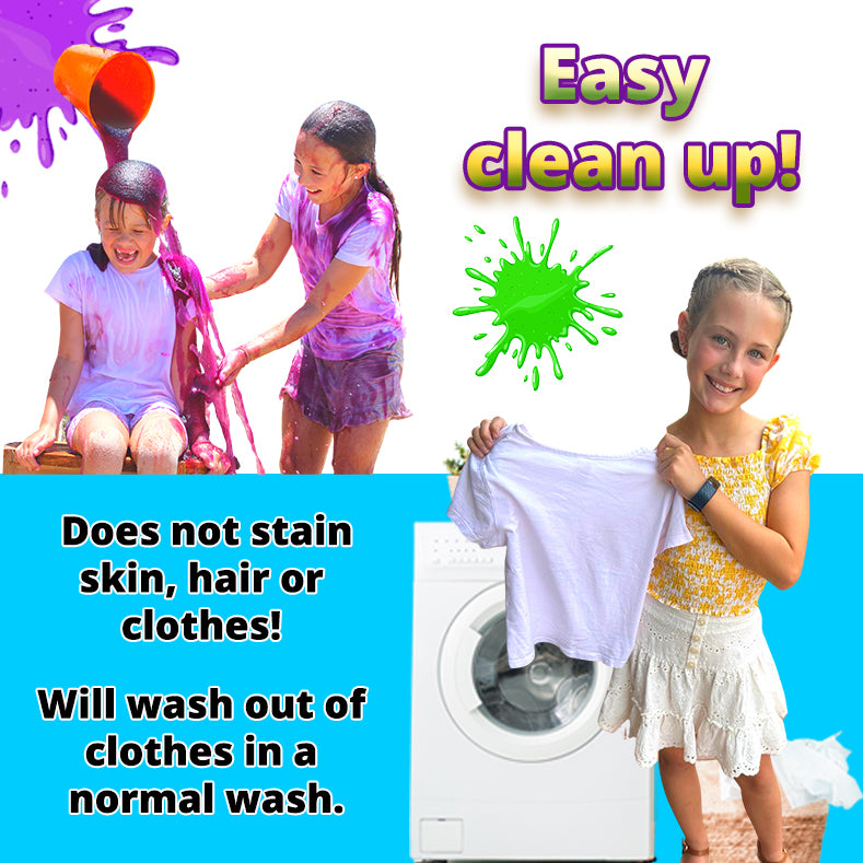 Party GOAT® Slime easily washes off skin & comes out of clothes in a normal washing cycle.