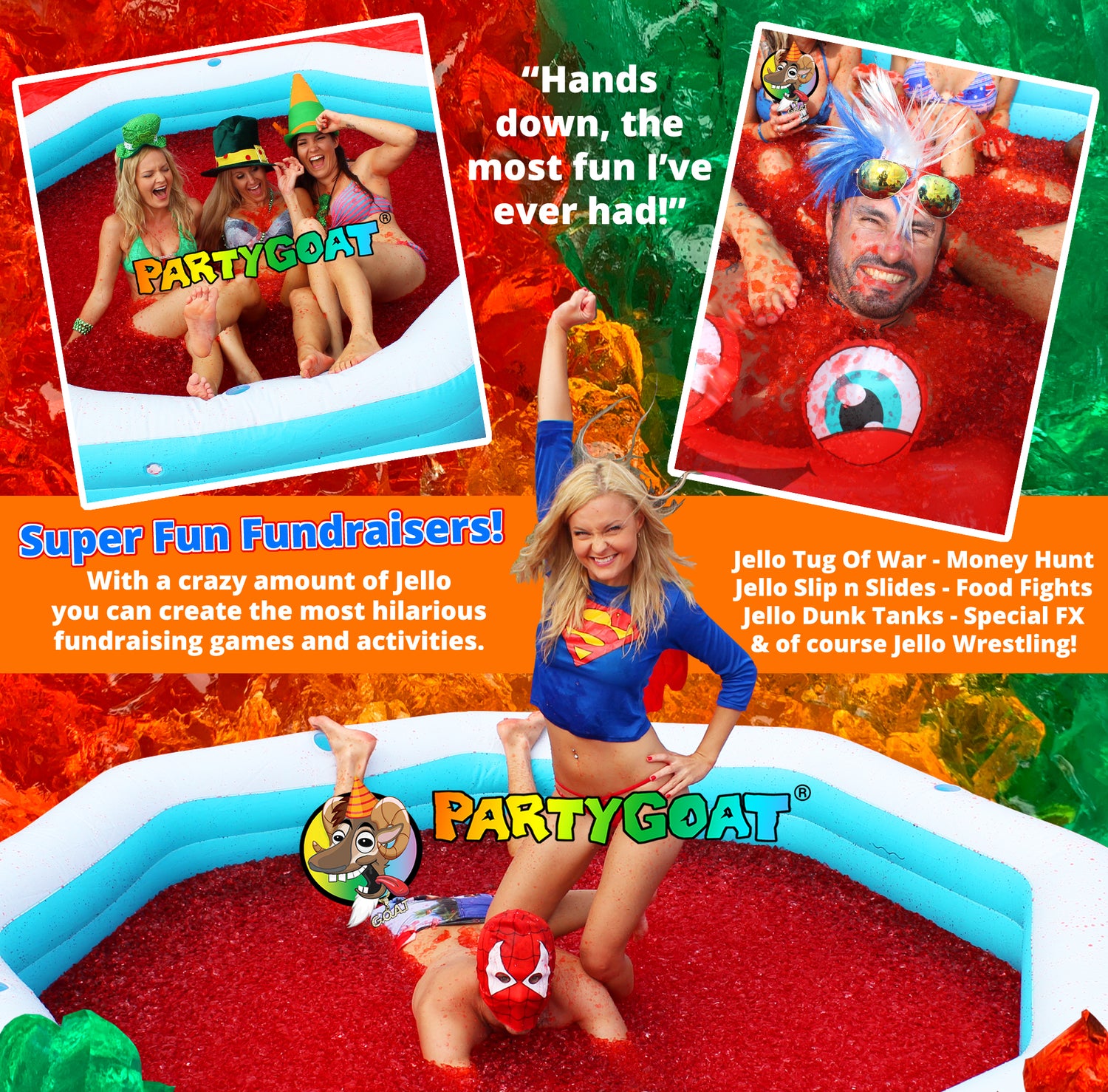 If you want to host a party with a difference you can't go past the excitement and fun of a Jello Wrestling Party. Jelly wrestling pools provide hilarious entertainment for both participants and spectators. Once experienced a jello wrestling party will never be forgotten. Our unique Party GOAT jello formula makes it so easy to set up and creates a wonderfully chunky, slippery and slimy jello texture for your wrestling pleasure.